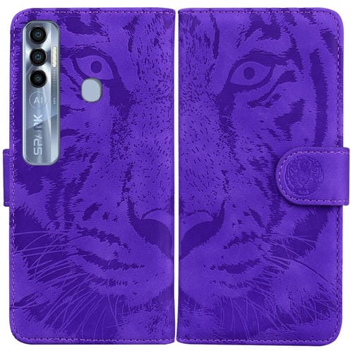 Funda para Tecno Spark 7 Pro con patrón Tiger embossing y tapa horizontal de cuero (Morado)
