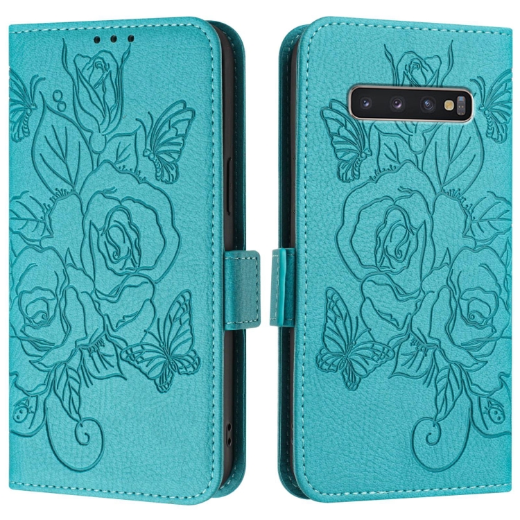 Funda de Cuero Antirrobo Rfid con Relieve para Samsung Galaxy S10+ (Azul Claro)