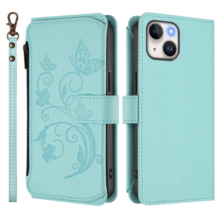Funda de cuero con cremallera para iPhone 14 Plus, diseño de mariposas, flores y amor (verde menta)