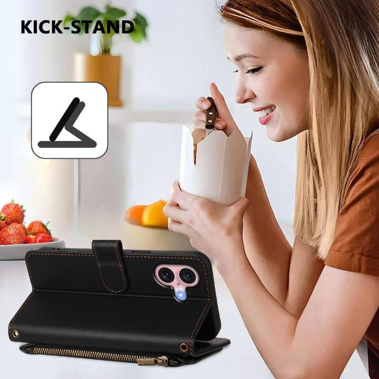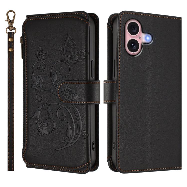 Funda de cuero con cremallera para iPhone 16, diseño de mariposas, flores y amor, con múltiples tarjetas (negro)