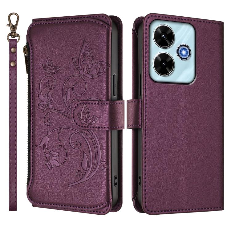 Funda de cuero con cremallera para Redmi 13 4G / 5G / 13x / Xiaomi Poco M6 4G, diseño de mariposas y flores, con múltiples tarjetas (morado oscuro)