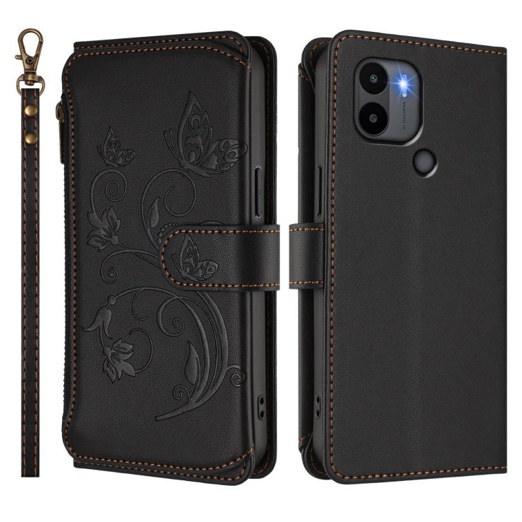 Funda de cuero con cremallera para Redmi A1+ / A2+ / Xiaomi Poco C51, diseño de mariposas y flores, con múltiples tarjetas (negro)