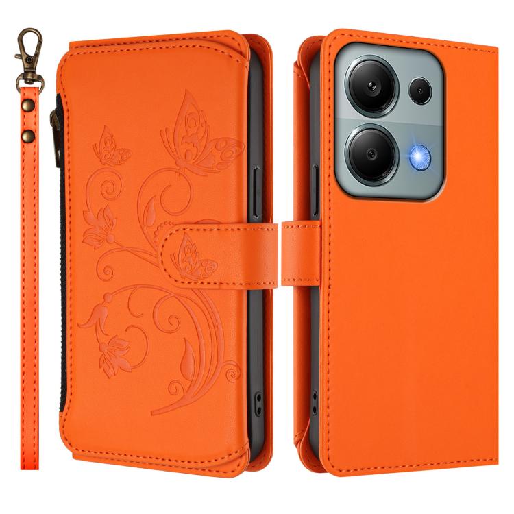 Funda de cuero con cremallera para Redmi Note 14S 4G / Note 13 Pro 4G, diseño de mariposas, flores y múltiples tarjetas (naranja)