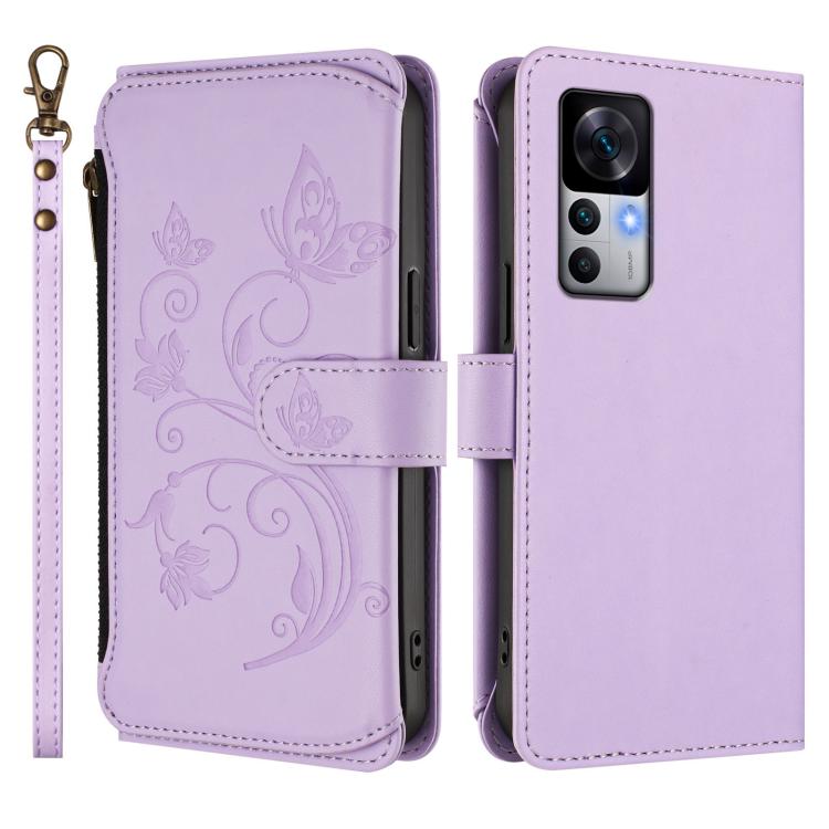 Funda de cuero con cremallera para Xiaomi 12T / 12T Pro / Redmi K50 Ultra, diseño de mariposas, flores y mariposas (morado claro)