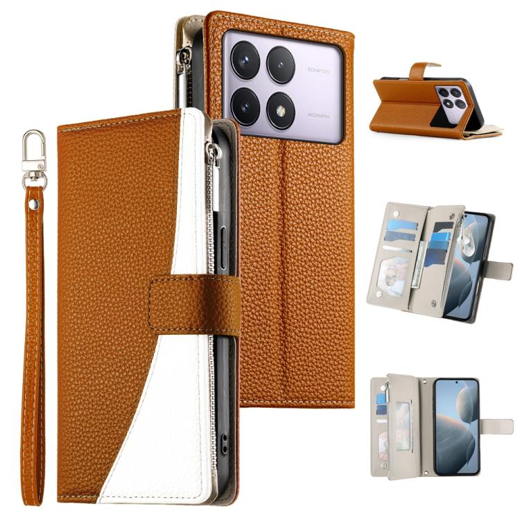Funda de cuero con cremallera y múltiples tarjetas para Redmi K70 / K70 Pro / Poco F6 Pro, con costuras y correa corta (marrón)