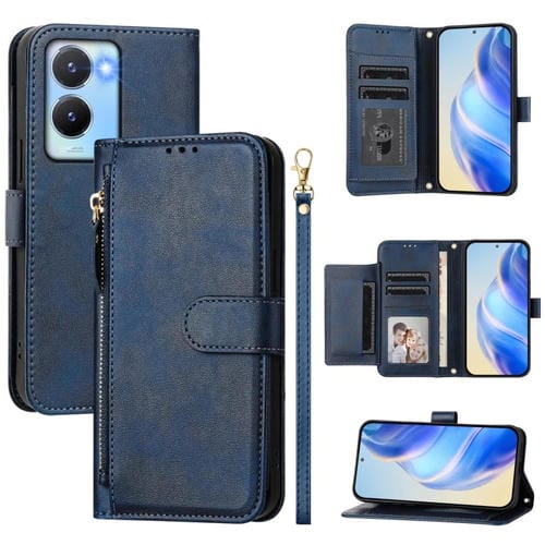 Funda de Cuero con Cremallera y Ranuras para Múltiples Tarjetas para Vivo Y56 5G / Y16 4G / Y02S 4G (Azul)