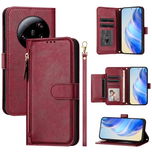 Funda de Cuero con Cremallera y Ranuras para Múltiples Tarjetas para Xiaomi 13 Ultra (Rojo Oscuro)