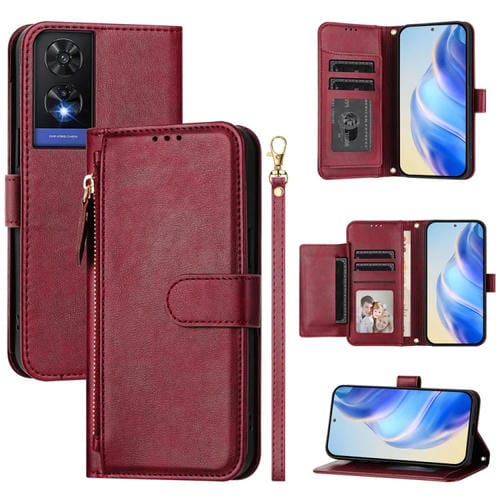 Funda de Cuero para TCL 505 con Cremallera y Ranuras para Tarjetas (Rojo Oscuro)