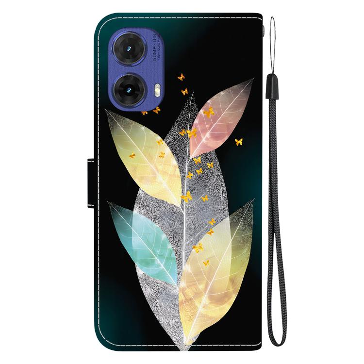 Funda de Cuero para Motorola Moto G85 con Dibujo de Hojas de Colores y Textura de Cristal