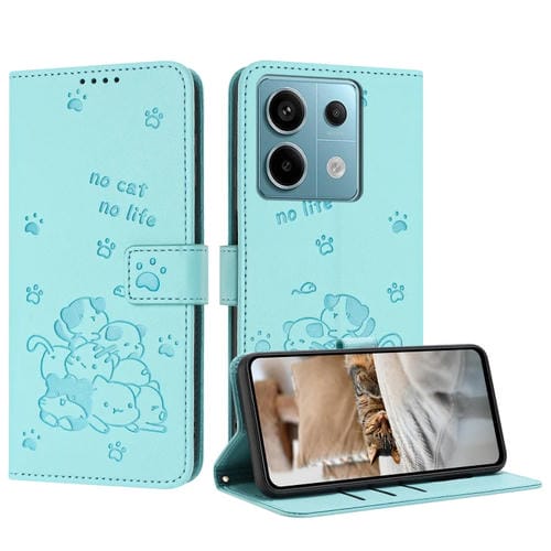 Funda de Cuero con Estampado de Gatito y Cordón para Redmi Note 13 Pro 5G (Verde Menta)