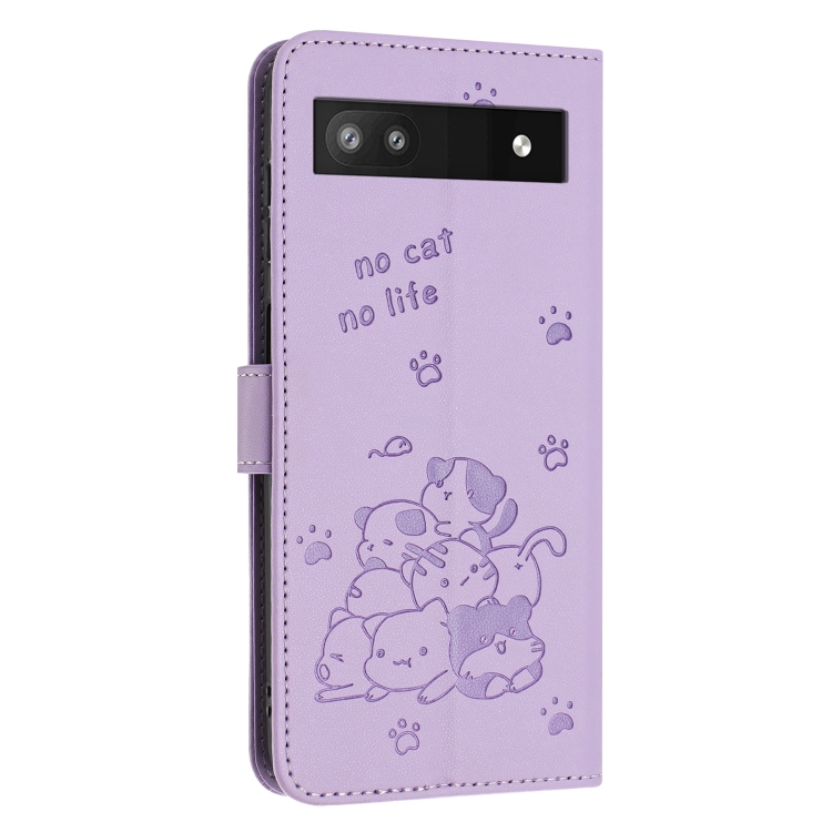 Funda de Cuero para Google Pixel 6A con Diseño de Gatito en Relieve y Cordón (Morado)