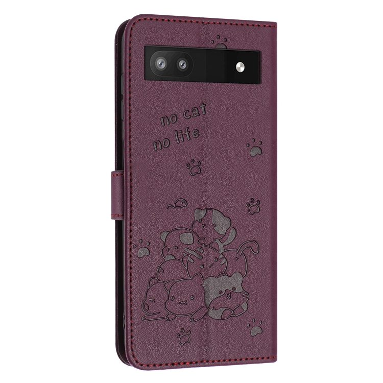 Funda de Cuero para Google Pixel 6A con Diseño de Gatito en Relieve y Cordón (Rojo Vino)