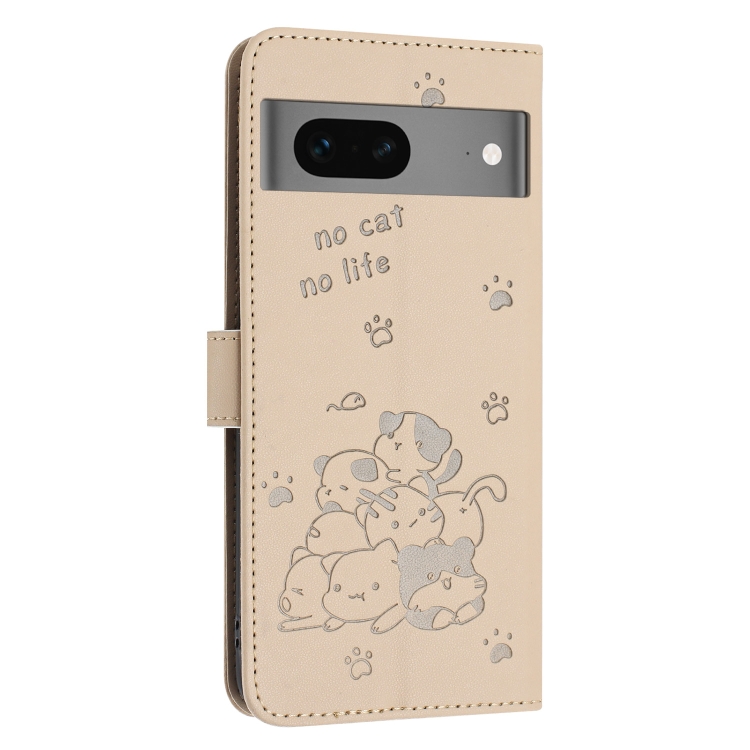 Funda de Cuero para Google Pixel 7 con Diseño de Gatito en Relieve y Cordón (Beige)