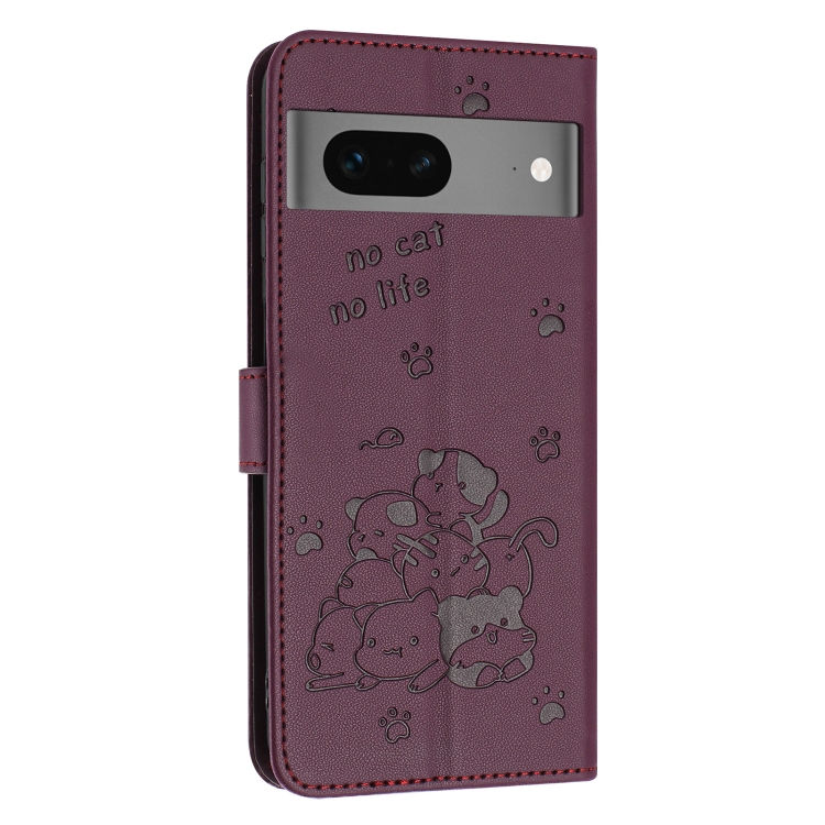 Funda de Cuero con Diseño de Gatito en Relieve para Google Pixel 7 con Cordón (Rojo Vino)