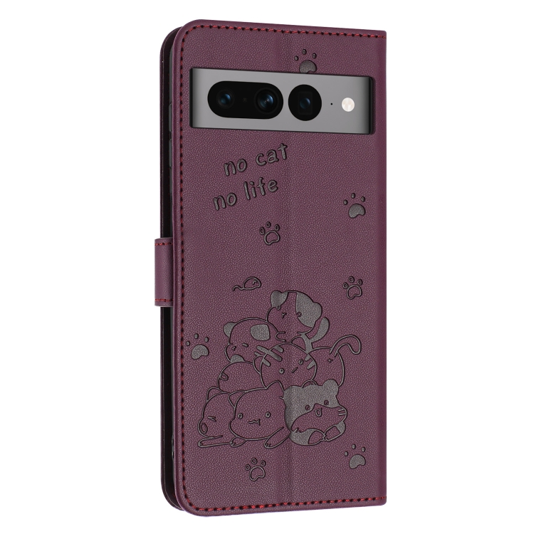Funda de Cuero para Google Pixel 7 Pro con Diseño de Gatito en Relieve y Cordón (Rojo Vino)