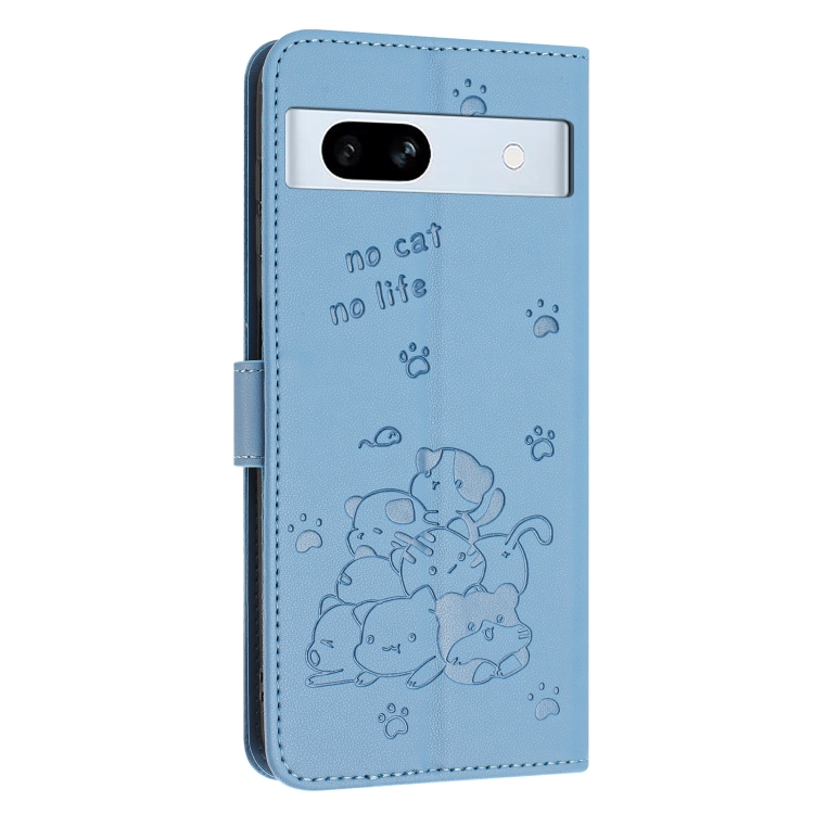 Funda de Cuero para Google Pixel 7A con Diseño de Gatito en Relieve y Cordón (Azul)
