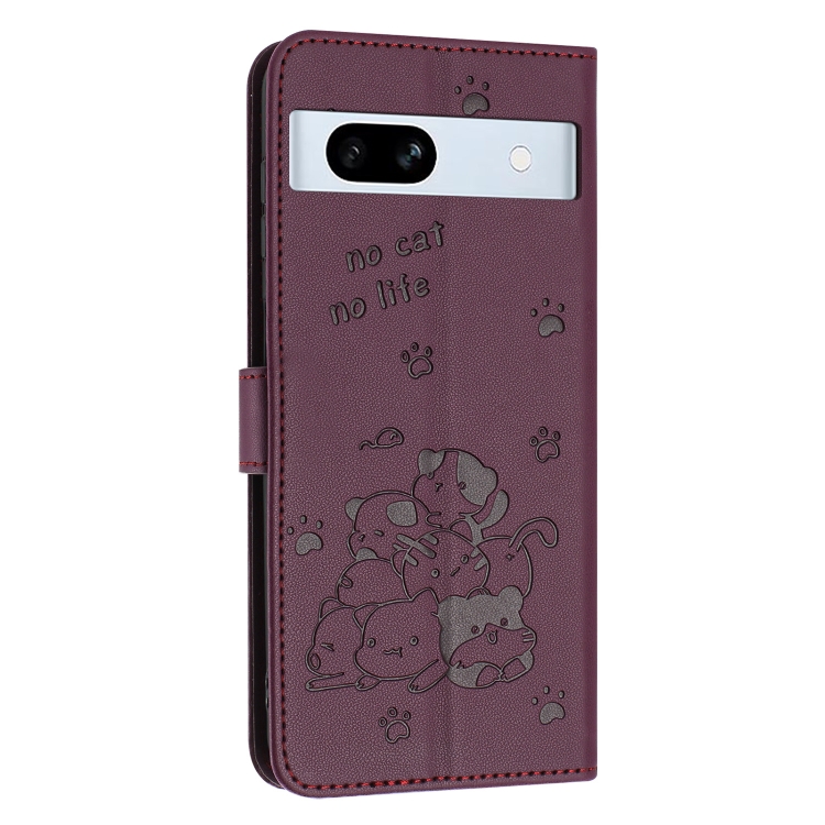 Funda de Cuero con Diseño de Gatito en Relieve para Google Pixel 7A con Cordón (Rojo Vino)