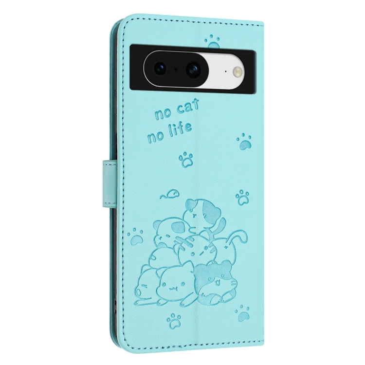 Funda de Cuero para Google Pixel 8 con Diseño de Gatito en Relieve y Cordón (Verde Menta)