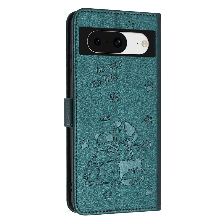 Funda de Cuero con Diseño de Gatito en Relieve para Google Pixel 8 con Cordón (Verde Oscuro)