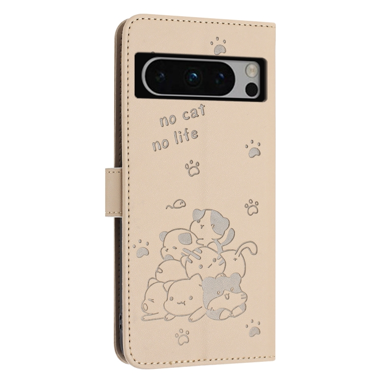Funda de Cuero Google Pixel 8 Pro con Diseño de Gatito en Relieve y Cordón (Beige)