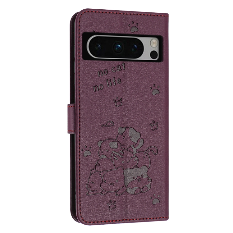 Funda de Cuero con Diseño de Gatito en Relieve para Google Pixel 8 Pro con Cordón (Rojo Vino)