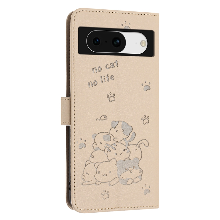 Funda de Cuero para Google Pixel 8A con Diseño de Gatito en Relieve y Cordón (Beige)