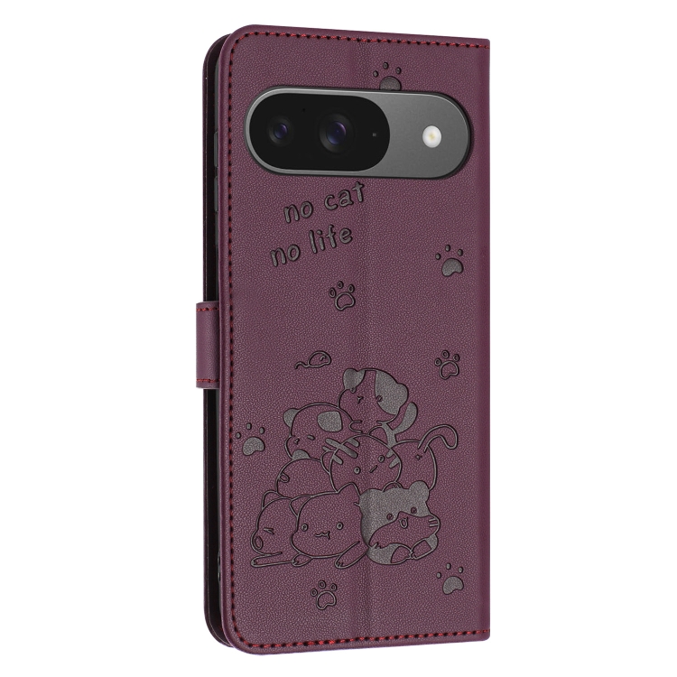 Funda de Cuero con Diseño de Gatito en Relieve para Google Pixel 9 y 9 Pro con Cordón (Rojo Vino)
