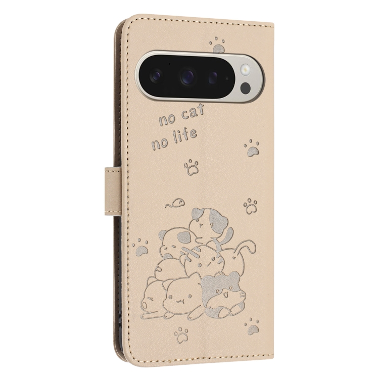 Funda de Cuero para Google Pixel 9 Pro XL con Diseño de Gatito en Relieve y Cordón (Beige)