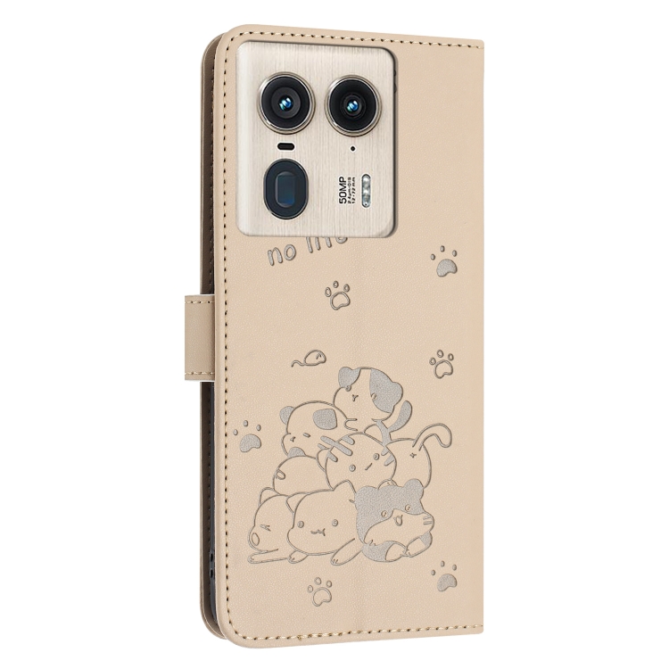 Funda de Cuero Motorola Edge 50 Ultra con Diseño de Gatito en Relieve y Cordón (Beige)