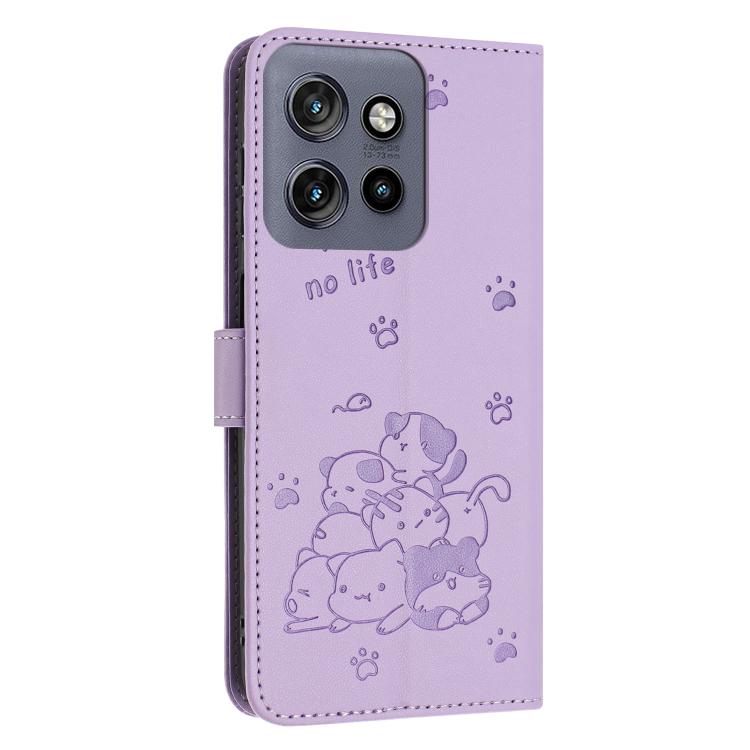Funda de Cuero Motorola Moto G 5G 2025 con Diseño de Gatito en Relieve y Cordón (Morado)