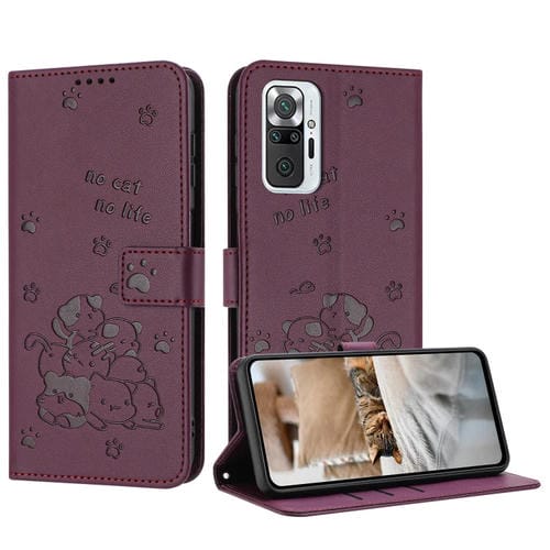 Funda de Piel con Diseño de Gatito En Relieve para Redmi Note 10 Pro con Cordón (Rojo Vino)
