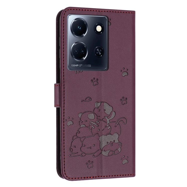 Funda de Cuero Infinix Note 30 y Note 30 5G con Diseño de Gatito en Relieve y Cordón (Rojo Vino)