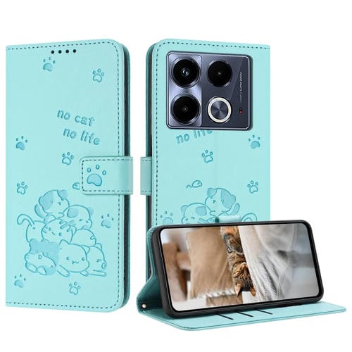 Funda de Cuero Infinix Note 40 4G con Diseño de Gatito en Relieve y Cordón (Verde Menta)