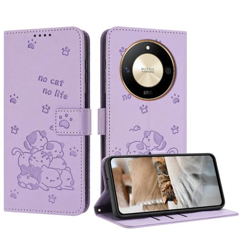 Funda de Piel con Diseño de Gatito en Relieve y Cordón para Honor X50/X9B (Morado)