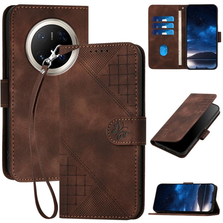 Funda de Cuero con Mariposas en Relieve y Cuadrícula para Huawei Mate 70 Pro y Mate 70 Pro+ con Cordón (Café)