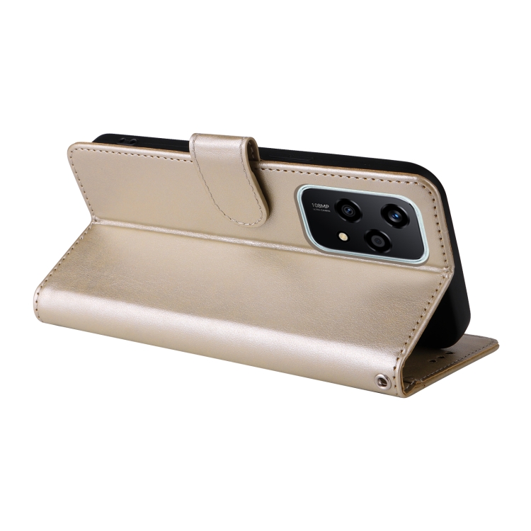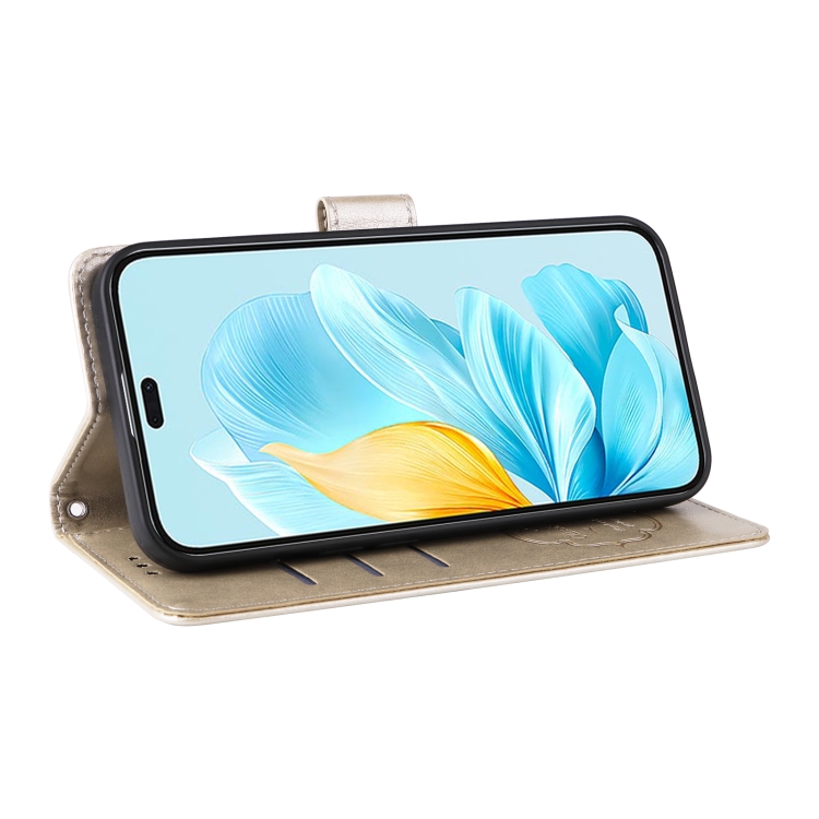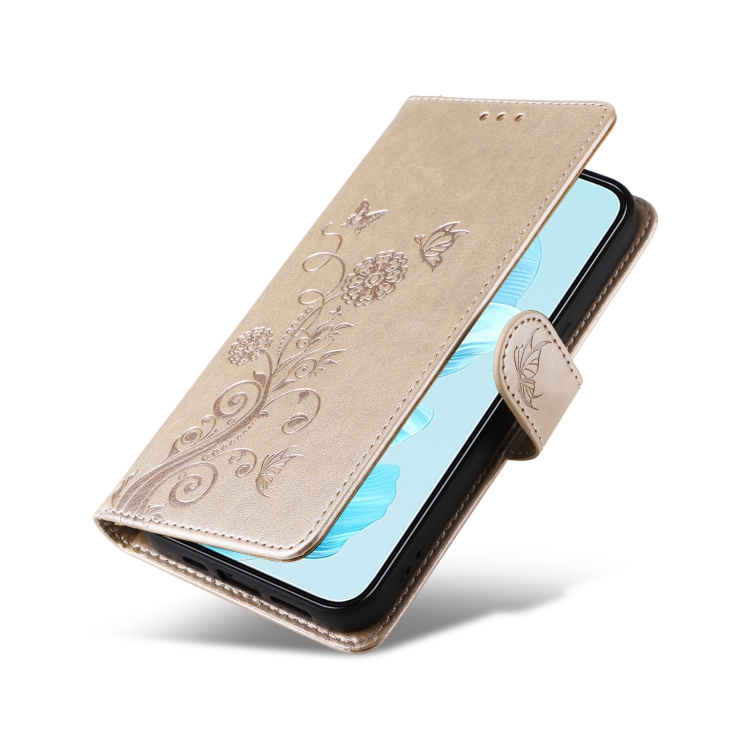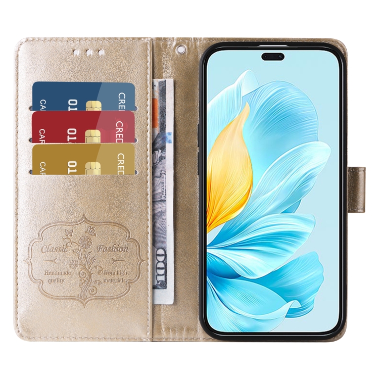 Funda de Cuero Honor 200 Lite con Diseño de Mariposas y Flores en Relieve (Dorada)