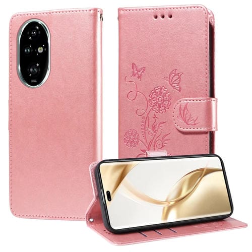 Funda de Cuero para Honor 200 Pro con Diseño de Mariposas y Flores en Relieve (Oro Rosa)
