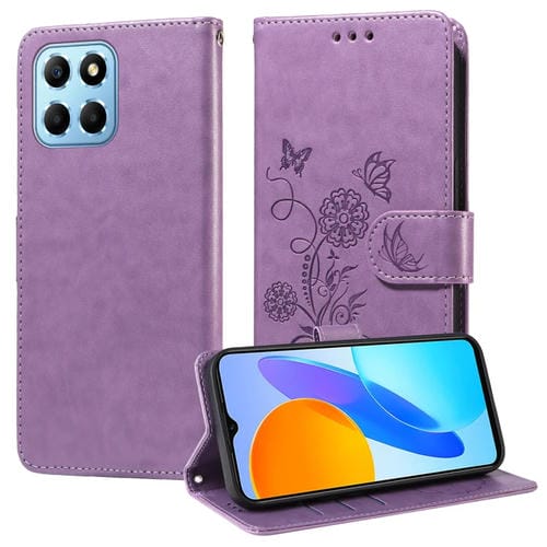 Funda de Cuero Honor Play 6C/X6S/70 Lite con Diseño de Mariposas y Flores en Relieve (Morado)