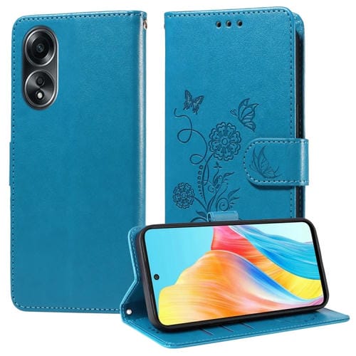 Funda de Cuero con Diseño de Mariposas y Flores En Relieve para Oppo A58 4G (Azul)