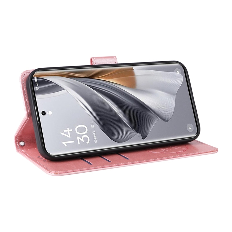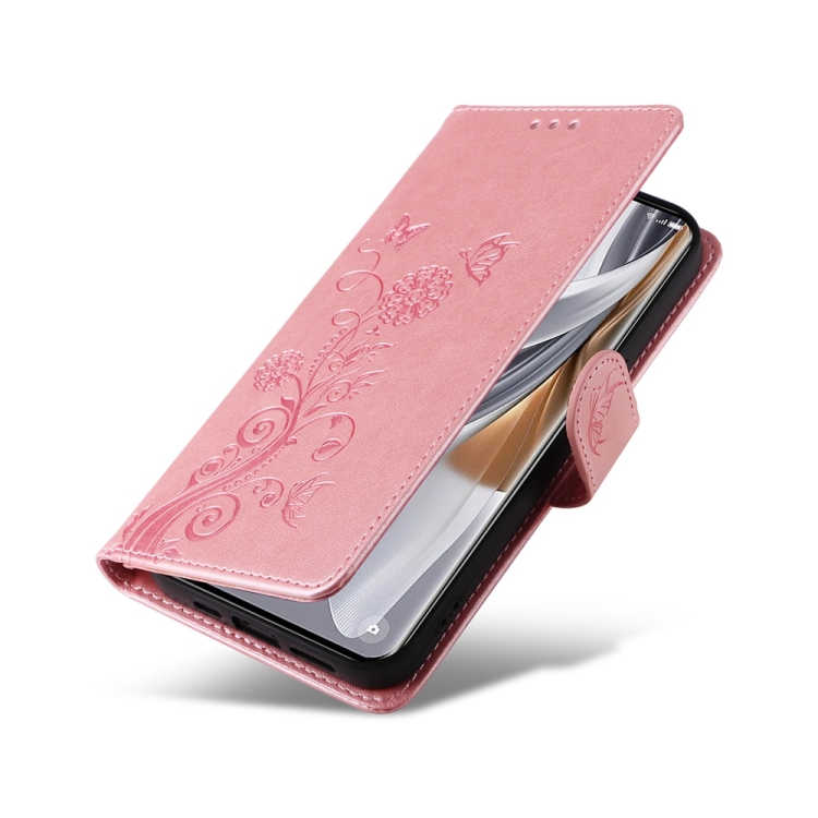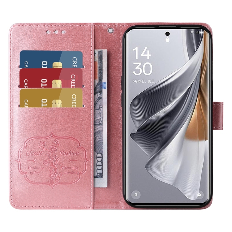 Funda de Cuero con Diseño de Mariposas y Flores En Relieve para Oppo Reno10/Reno10 Pro (Oro Rosa)