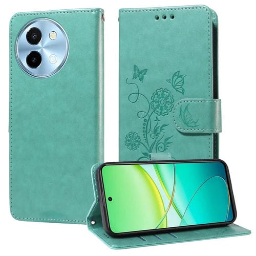 Funda de Cuero con Diseño de Mariposas y Flores En Relieve para Vivo Y38 5G / T3X 5G (Verde)