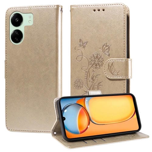 Funda de Cuero con Diseño de Mariposas y Flores En Relieve para Xiaomi Poco C65/M6 5G (Dorada)