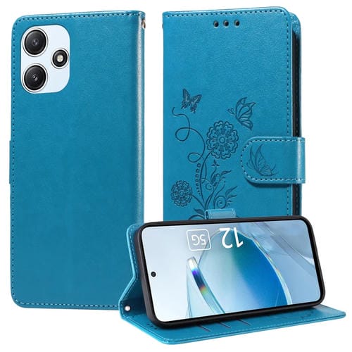 Funda de Cuero con Diseño de Mariposas y Flores En Relieve para Xiaomi Poco M6 Pro 5G (Azul)