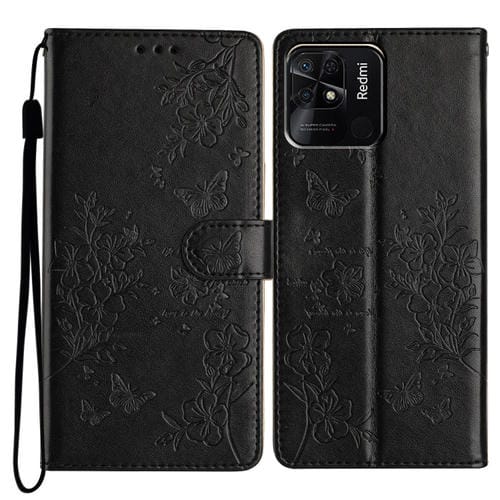 Funda de Cuero con Diseño de Mariposas y Flores para Redmi 10C (Negra)