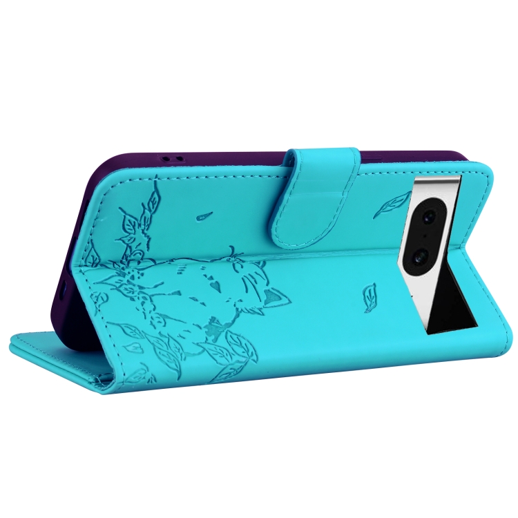 Funda de Cuero con Estampado de Gato para Google Pixel 8 (Azul Lago)