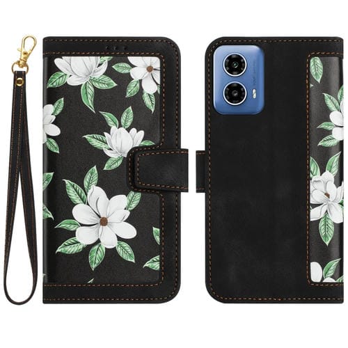Funda de Cuero con Estampado Floral y Cordón para Motorola Moto G34 (Negro)