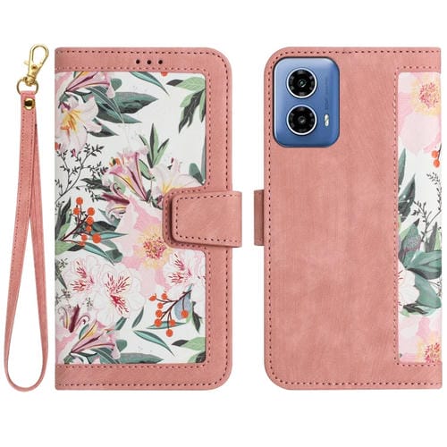 Funda de Cuero con Estampado Floral y Cordón para Motorola Moto G34 (Rosa)