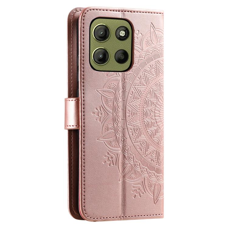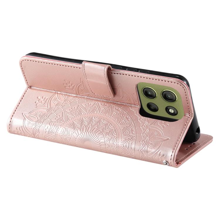 Funda de Cuero con Relieve de Flores para Motorola Moto G15 con Cordón (Oro Rosa)