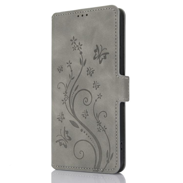 Funda de Cuero iPhone 12 Mini con Relieve Mariposa y Flor de Amor (Gris)