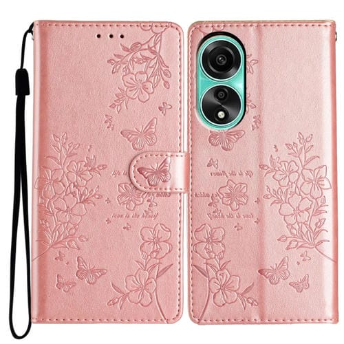 Funda de Cuero con Relieve de Mariposa y Flor para Oppo A38 4G/A18 (Oro Rosa)